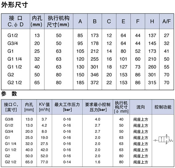 接口尺寸: 3/8”~ 2-1/2” (DN10 ~ DN65), BSP或NPT 螺紋執(zhí)行器缸徑:40、50、63、90mm